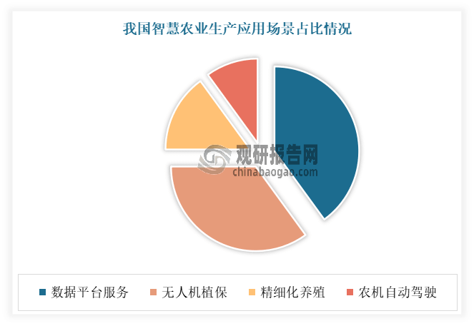 从出产使用场景来看,目前我国聪慧农业出产环节次要无数据平台办事、无人机植保、精细化养殖、此中数据平台办事占比最高,达到40%;其次是无人机植保,占比为35%,而精细化养殖、农机从动驾驶占比各部位15%、10%。